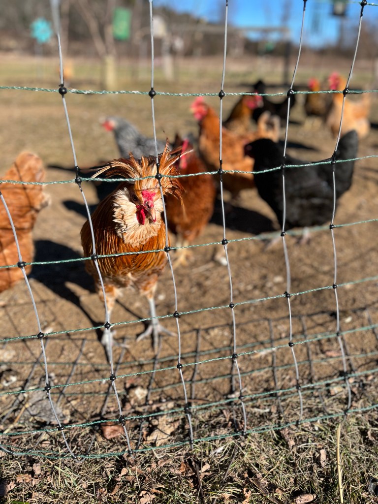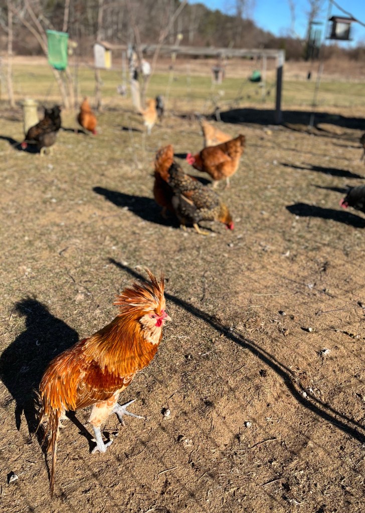 Collecting eggs, complicated by an ornery rooster (pictured front and center).